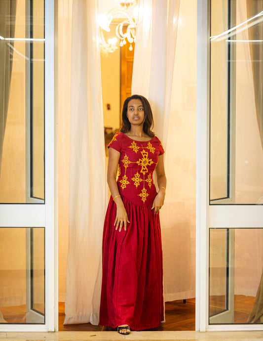 Royal Elegance: Embroidered Red Slim Fit Ethiopian Dress