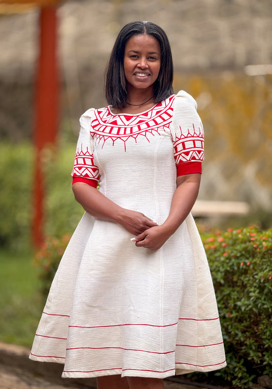 Royal Glow – White Ethiopian Short Dress with Red Circle Neck Embroidery