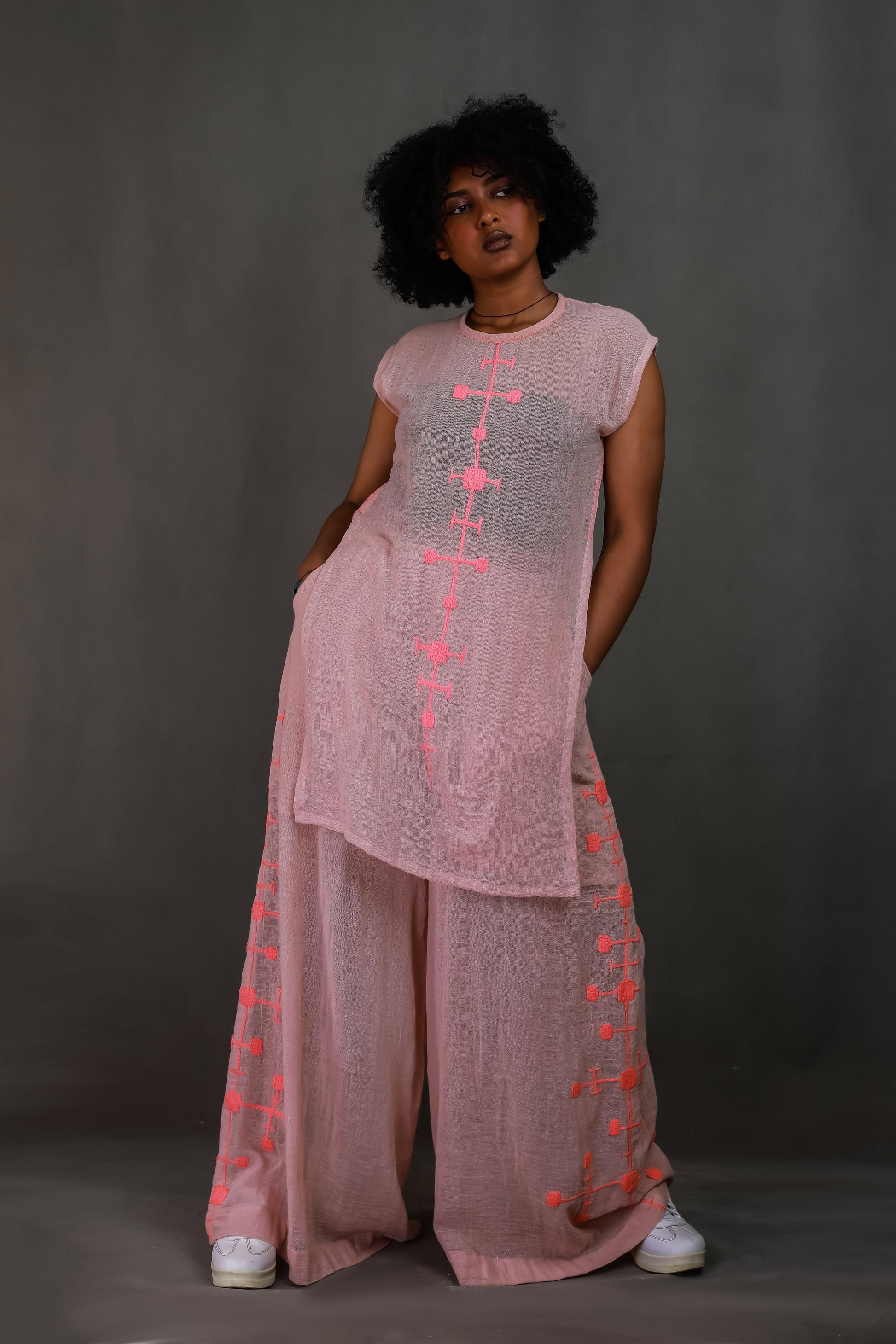 Introducing the ‘Habesha Harmony: Embroidered Women’s Top and Trouser Duo’. This set is a harmonious blend of Ethiopian  tradition and Ethiopian fashion, featuring intricate Habesha embroidery that adds a touch of Ethiopian heritage to your wardrobe. The top and trouser duo is crafted from high-quality fabric, ensuring comfort without compromising on style. The embroidery, inspired by Habesha culture, adds a unique aesthetic appeal to the ensemble. Whether you’re attending a cultural event or simply appreciate the beauty of Habesha designs, this set is a perfect choice. Embrace the harmony of style and tradition with this exquisite ensemble.